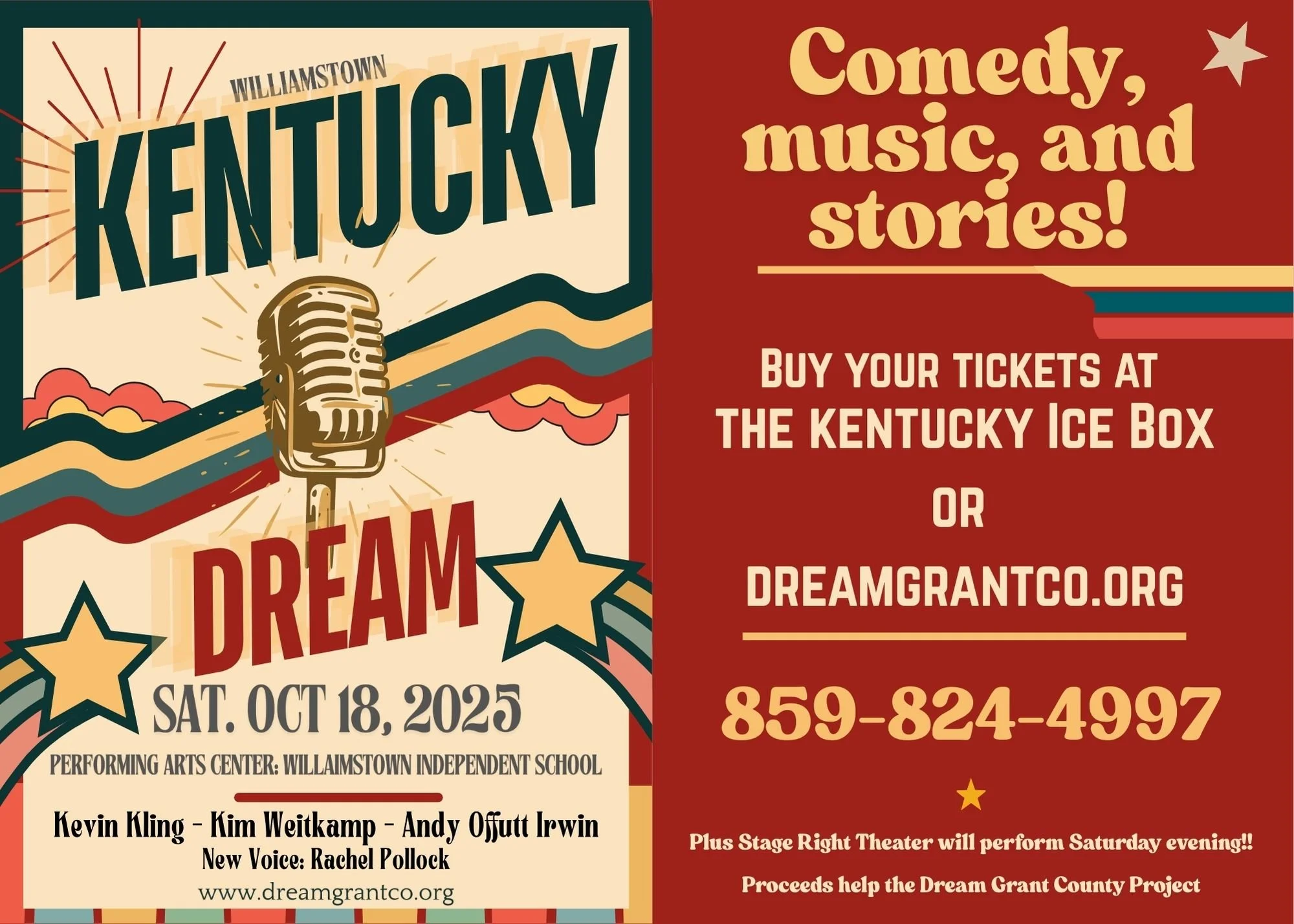 “Kentucky DREAM Storytelling Festival/Fundraiser Saturday, October 18, 2025 9:30 AM 9:00 PM Williamstown Performing Arts Center 300 Helton Road Williamstown, KY, 41097 United States (map) Google Calendar ICS “2nd Annual Kentucky DREAM Storytelling Festival/Fundraiser” featuring storytellers Kevin Kling, Kim Weitkamp and Andy Ouffitt Irwin! One day only at the Williamstown Performing Arts Center, Williamstown, Kentucky. More Info and Tickets